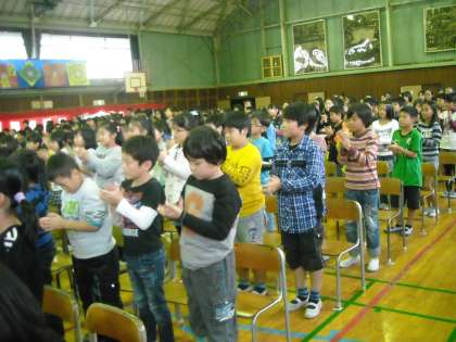 児童全員による「夕やけkやけ」の披露やお祝いの言葉で盛り上げました。