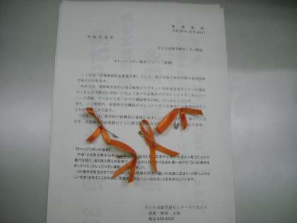 11月は「児童虐待防止推進月間」です。様々な取り組みがありますが、市職員全員がオレンジリボンをつけて活動のアピールをします。