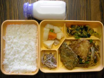 ごはん・魚の2色揚げ・かわりきんぴら・野菜ののり和え・塩肉じゃが・ゆかりもやし