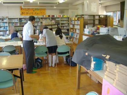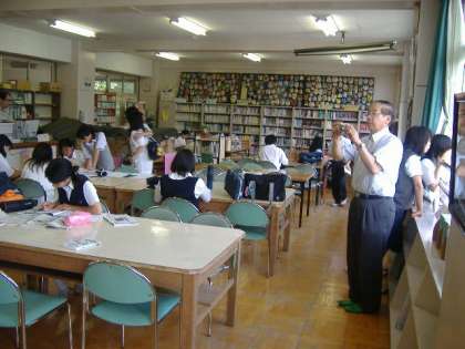 図書室の使用状況を視察した後、図書室の有効利用や、読書推進についての西校長先生と話し合いをもたれました。