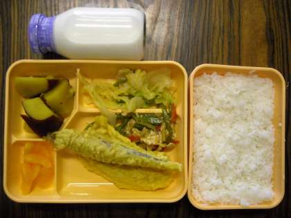 ごはん・チンジャオロース・ししゃもとイカのカレー天・キャベツのしょうが風味