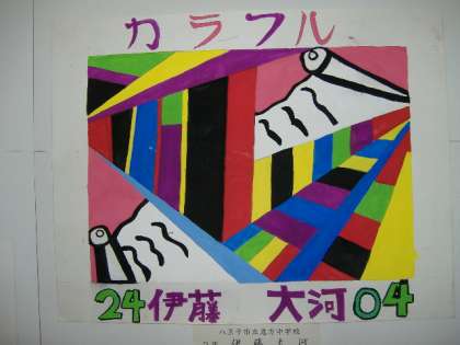 透視図法や投影図法を活用した平面構成と、レタリングによる文字のデザインの総合的作品です。