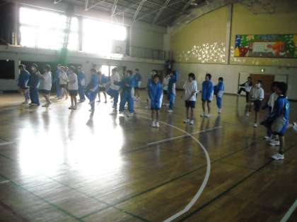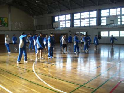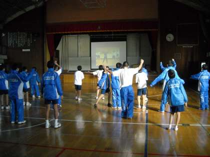 男子は体育館でビデオを見ながら楽しそうにダンスの実習です。