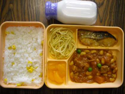 コーンライス・ポークと豆のトマト煮込み・ペペロンチーノ・タンドリーフィッシュ・