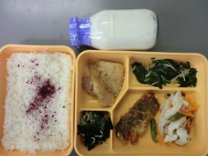 ゆかりごはん・白身魚の香り揚げ山芋の塩炒め・ほうれん草とえのきのソテー鶏肉のゆずみそ焼きわかめとじゃこのさっと煮