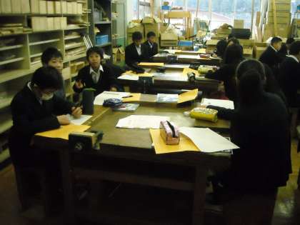 技術科室で木材についてプリントにまとめていました