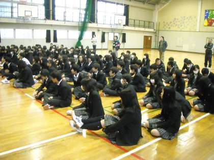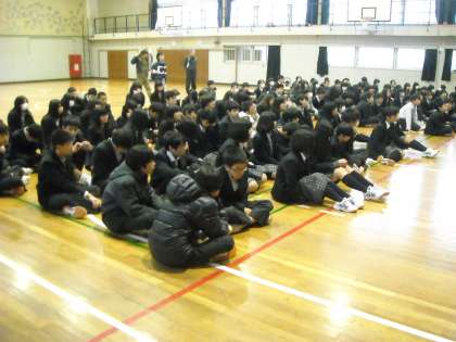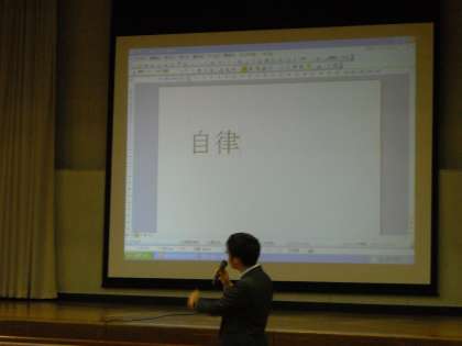 体育館に集まって、堀越先生から3学期のキーワード「自律」について話を聞きました。