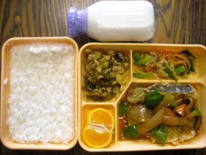 ごはん・白身魚の酢豚風・3色ナムル・クーブイリチー・果物
