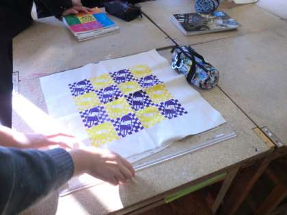布にデザインをプリントしています。