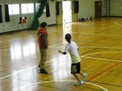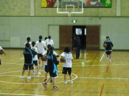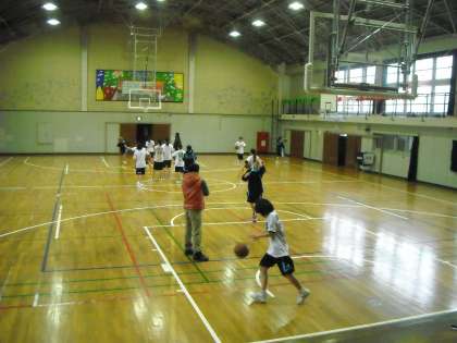 午後の体育館ではバスケットボール部の練習です。外部コーチも入ってリバウンドシュートの練習です。