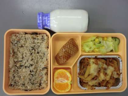 ひじきピラフなすときのこのミートグラタンコールスローいかの松ぼっくり煮・果物