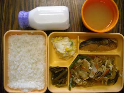 ごはん・スタミナ炒め・ミルクポテト・タンドリーフィッシュ・茎わかめの梅しょうゆ・