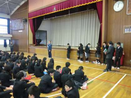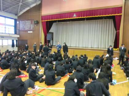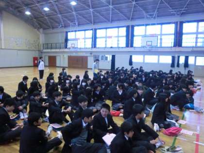 1年生は月曜日からの移動教室に向けて、体育館に集まって事前指導です。