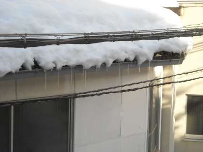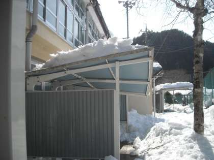 どこも厚い雪やつららに覆われています。体育館裏の駐輪場の屋根が一部潰れていました。