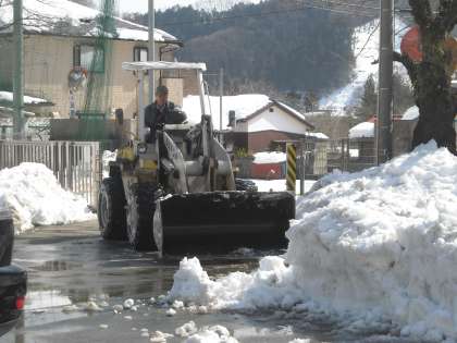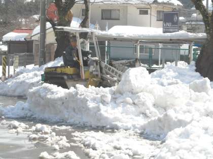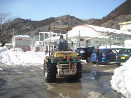 用務員のお知り合いの建設会社が陣馬街道の除雪をしていたので、お願いして入り口脇だけを除雪してもらいました。