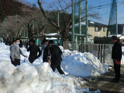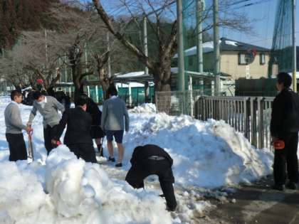 校庭にはまだ多くの雪が残っています。