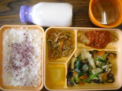 ゆかりごはん・海鮮塩炒め・とりチリ・しらたきのチャプチェ・果物・中華スープ