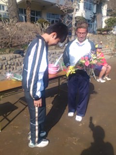 最後はセレモニーです。在校生と親の会から手紙、寄せ書き、記念の楯、ミニタオル、花束が贈られました。卒業生はそれを胸に在校生に言葉を残しました。