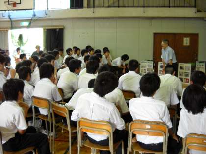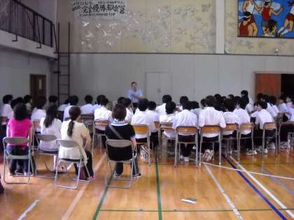 蒸し暑い体育館でしたが、参加者は熱心に講演を聞いていました。