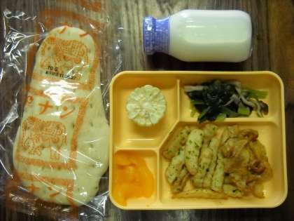 ナン・タンドリーチキン・いそべフレンチ・とうもろこし・小松菜とシメジのソテー・果物