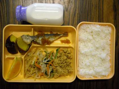 ごはん・ビビンバ・豆アジの南蛮漬け・さつま芋の甘煮・果物