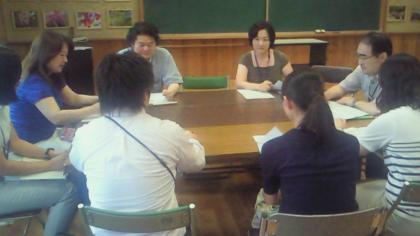 視聴覚室で全体会の後、教科ごとの分科会を行いました。