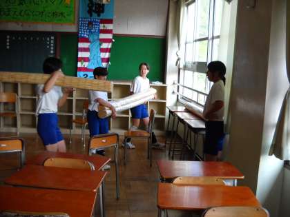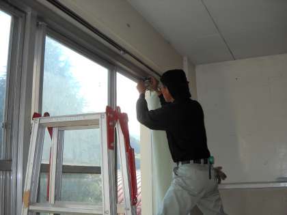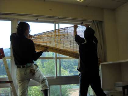 サッシに吊り下げ器具を取り付け、すだれをさげます。