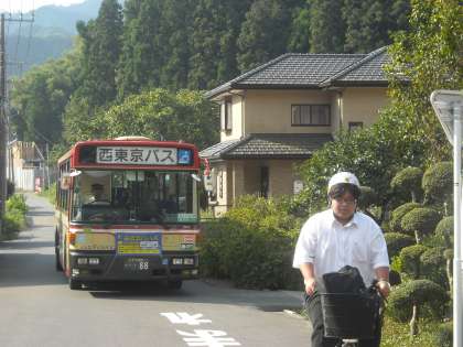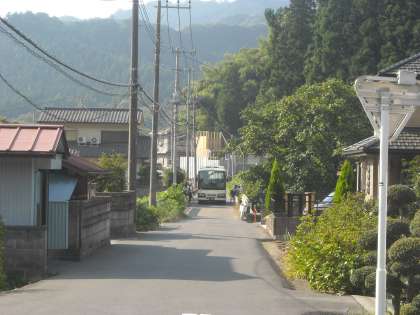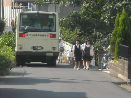 学校前の狭い道を大きな車とすれ違います。1列に並んで走行するのがマナーです。