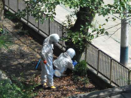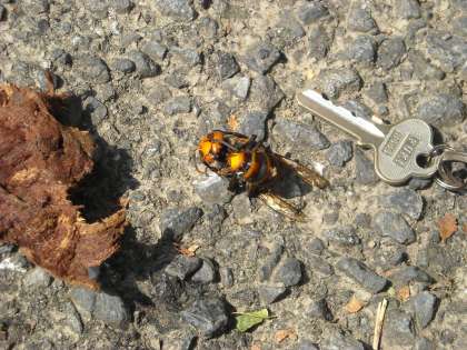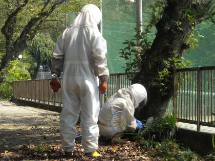 木の洞の中にあったので、中を除去し消毒しました。飛んでいる蜂はバドミントンのラケットで撃退していました。2〜3日は遠征していた働き蜂が帰ってくるので、近づかないようにしてください。