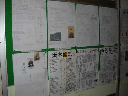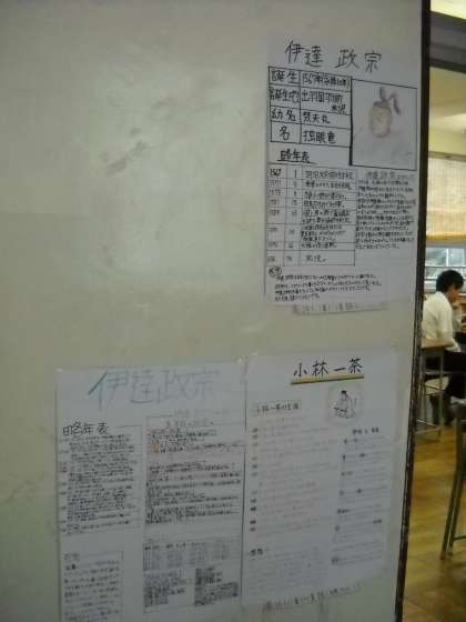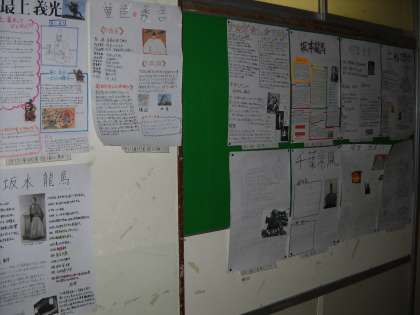 二年生の教室の廊下には、社会科の夏休みの宿題である「歴史新聞」が掲示されています。