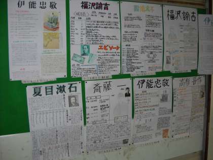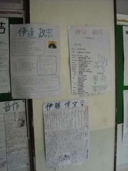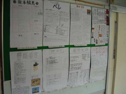 二年生の教室の廊下には、社会科の夏休みの宿題である「歴史新聞」が掲示されています。