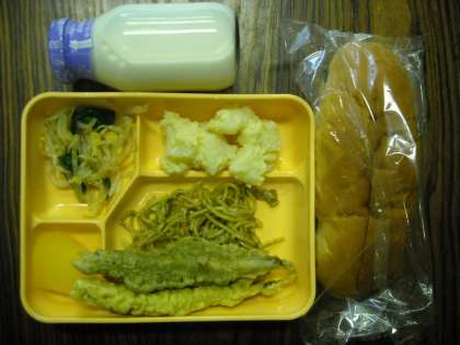 パン・ししゃもの2色フリッター・チンゲン菜のサラダ・焼きそば・