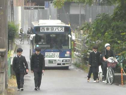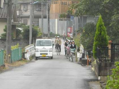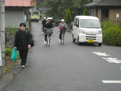 狭い道を車とすれ違うので1列に並んで登校しましょう。