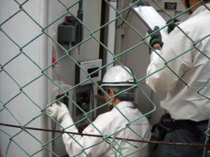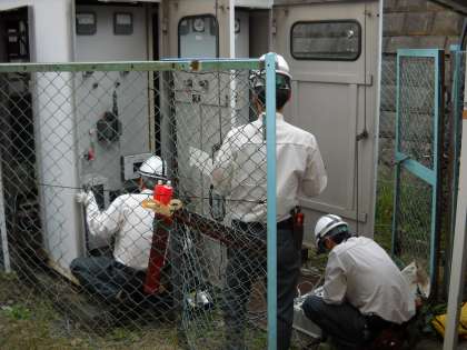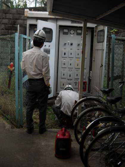 点検の担当の方々が、変電ボックスを開けて点検していました。