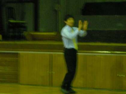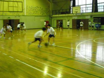 体育館ではバスケットボール部が練習しています。顧問の岸先生が厳しい目で見守っています。