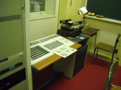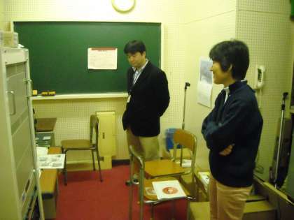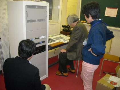 英語科の3人の先生が放送室からテープを流してリスニングテストを行います。