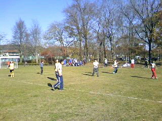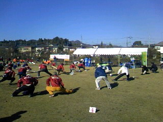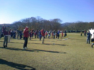 準備運動の後、ドッヂビー、グラウンドゴルフ、フットサルに分かれて開始です。