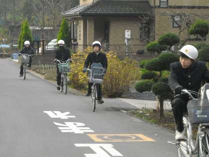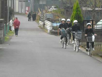 粕谷先生が橋のたもとに立って1列走行の指導をしています。