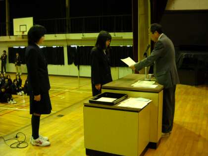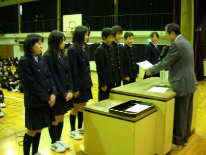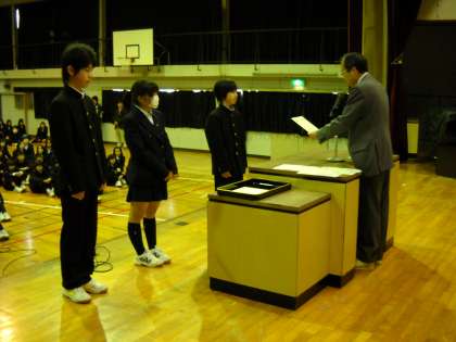 表彰では、八王子市中P連主催の「科学コンクール」、恩方地区青少対主催の「健全育成標語」、後期生徒会役員の認証と続きました。