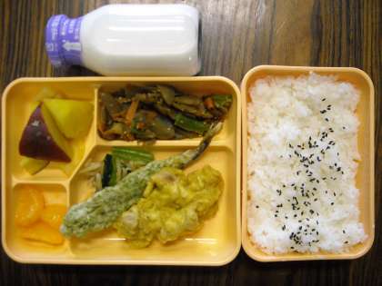ごまごはん・鶏肉とししゃもの磯辺天・野菜のおかか和え・ごぼうのきんぴら・