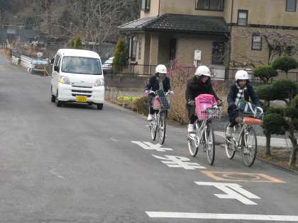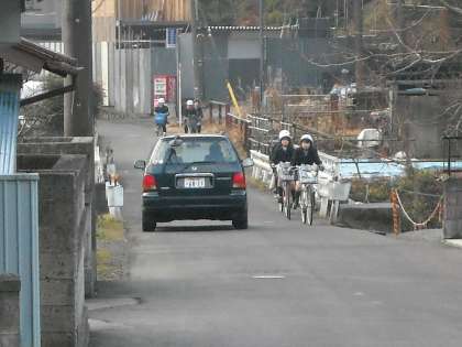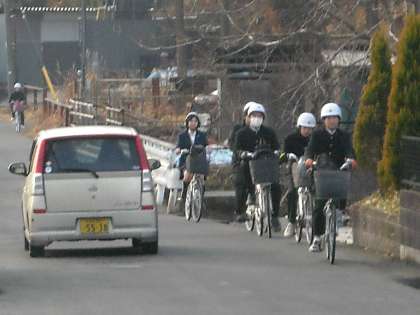 今朝も車の通行が多く、自転車は1列走行で安全に走ります。