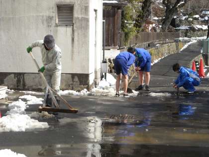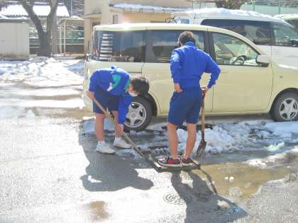 校庭が使えないので、3年生の男子は高野先生の指導で雪かきです。