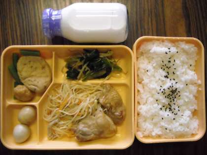 ごまごはん・鶏肉の七味焼き・ビーフン炒め・おひたし・がんもどきの含め煮・煮卵