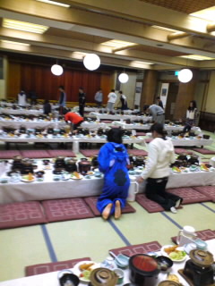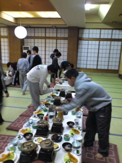 楽しい夕食の時間です。食事係が打ち合わせ後、お吸い物と飲み水をセットしました。
