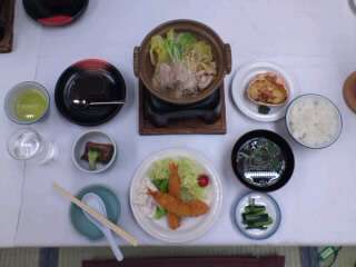 寄せ鍋、海老フライ、サラダ、カニグラタン、豚角煮、吸い物、野沢菜、ご飯、チョコレートケーキ