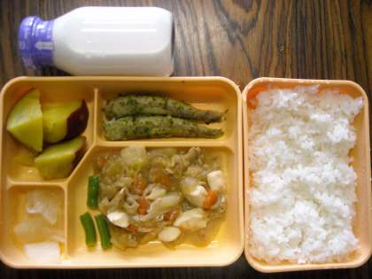 ごはん・肉豆腐・ニギスの磯辺揚げ・さつま芋のレモン煮・かぶの甘酢漬け