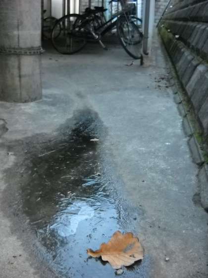 水たまりも、ばっちり凍っています。