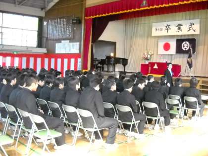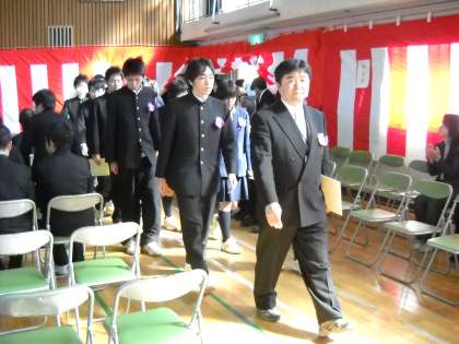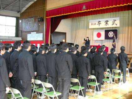 4クラスの入場後、東北地方の大震災で犠牲になった方々の冥福を祈り、黙祷を行った後、開式しました。国家と校歌の斉唱です。