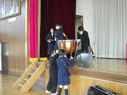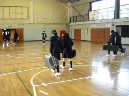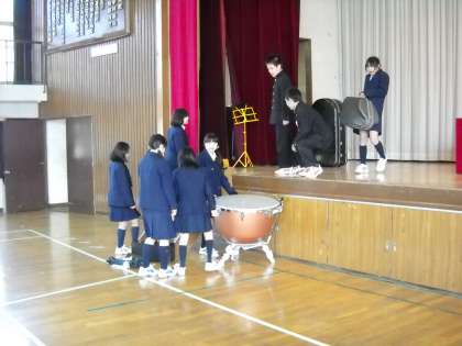 吹奏楽部は、明日の入学式に向けて、楽器を所定の位置に片付けます。