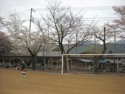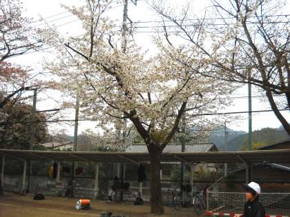 桜の花がほとんど散る中で、ここに来て校庭の真ん中の桜が満開となりました。